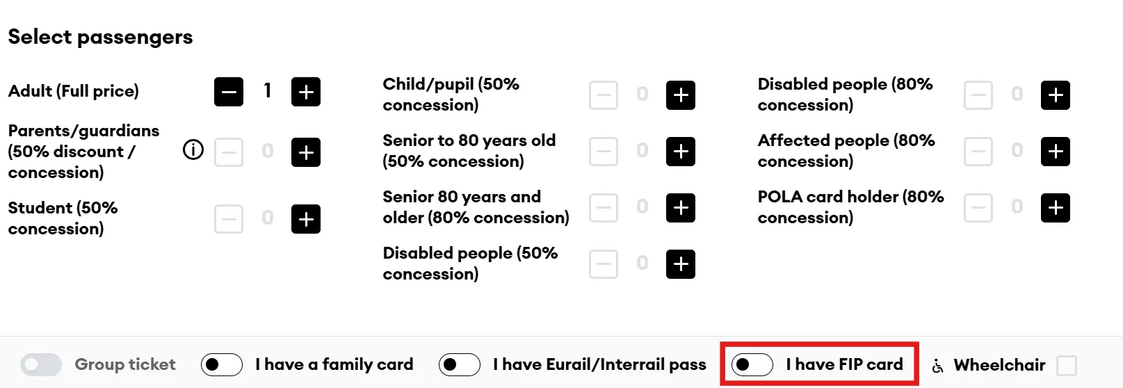 On the LTG-Link booking website, reservations and zero-fare tickets for LTG-Link connections in Lithuania and Latvia are sold. To do this, select the I have FIP card option in the passenger/discounts overview. Then, enter the FIP Card number and select the FIP discount 100% option.